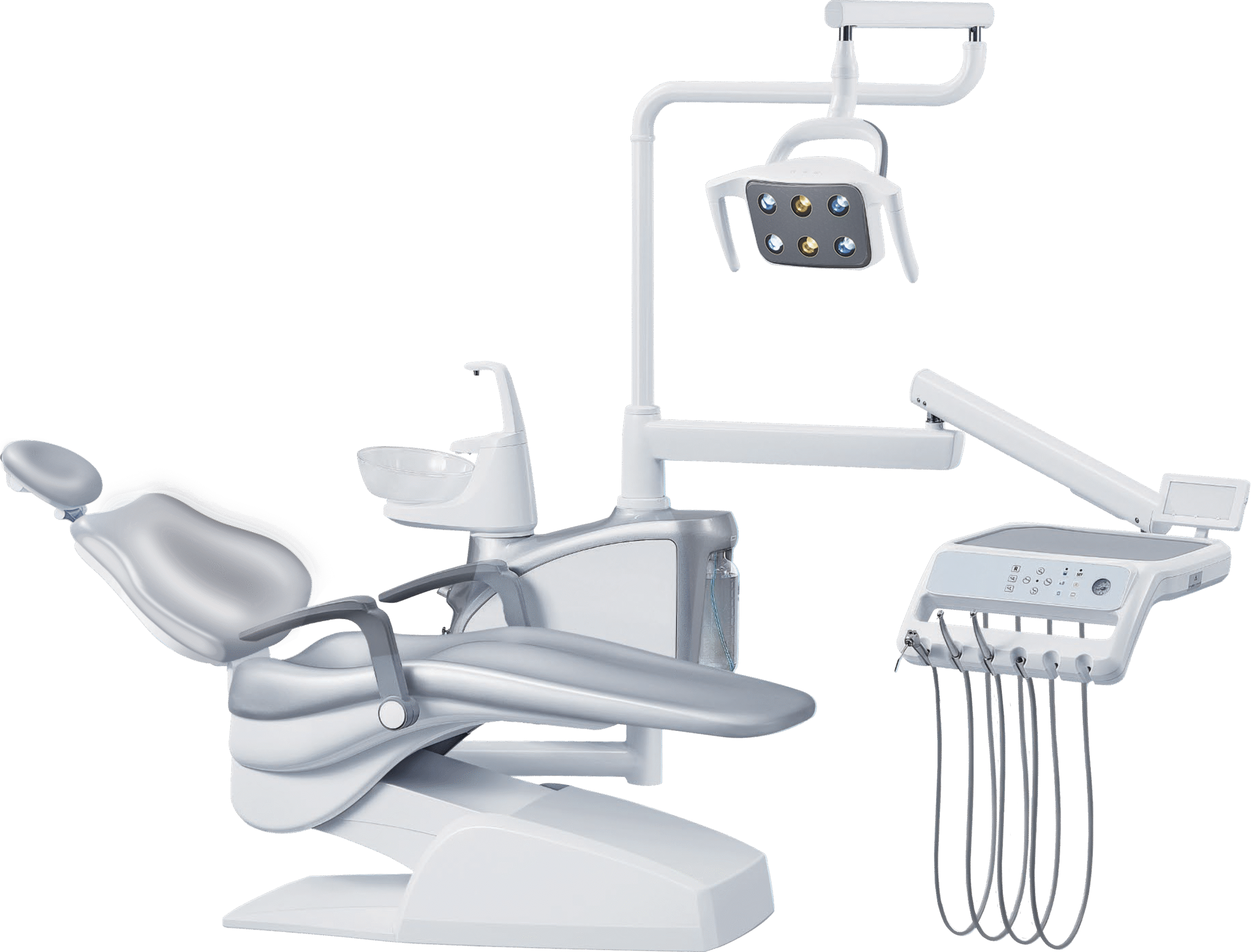Comprehensive dental unit featuring a rotary glass cuspidor, constant-temperature water system, high and low suction, and an advanced instrument tray with full-function control panel. Equipped with a comfortable patient chair, luxury LED operation light, built-in ultrasonic scaler, assistant tray, and ergonomic dentist stool, delivering efficient workflow, patient comfort, and reliable performance with a 2-year warranty.